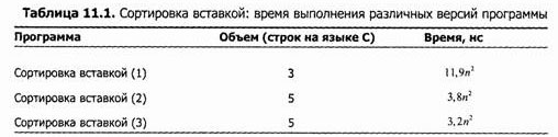 Для случайного расположения элементов во входном массиве, как и в худшем случае (обратный порядок сортировки), время выполнения сортировки вставкой пропорционально O(n2). Таблица 11.1 содержит данные о времени выполнения трех программ, когда на вход подается n случайных целых чисел: